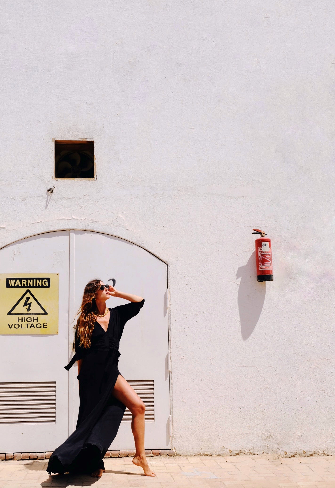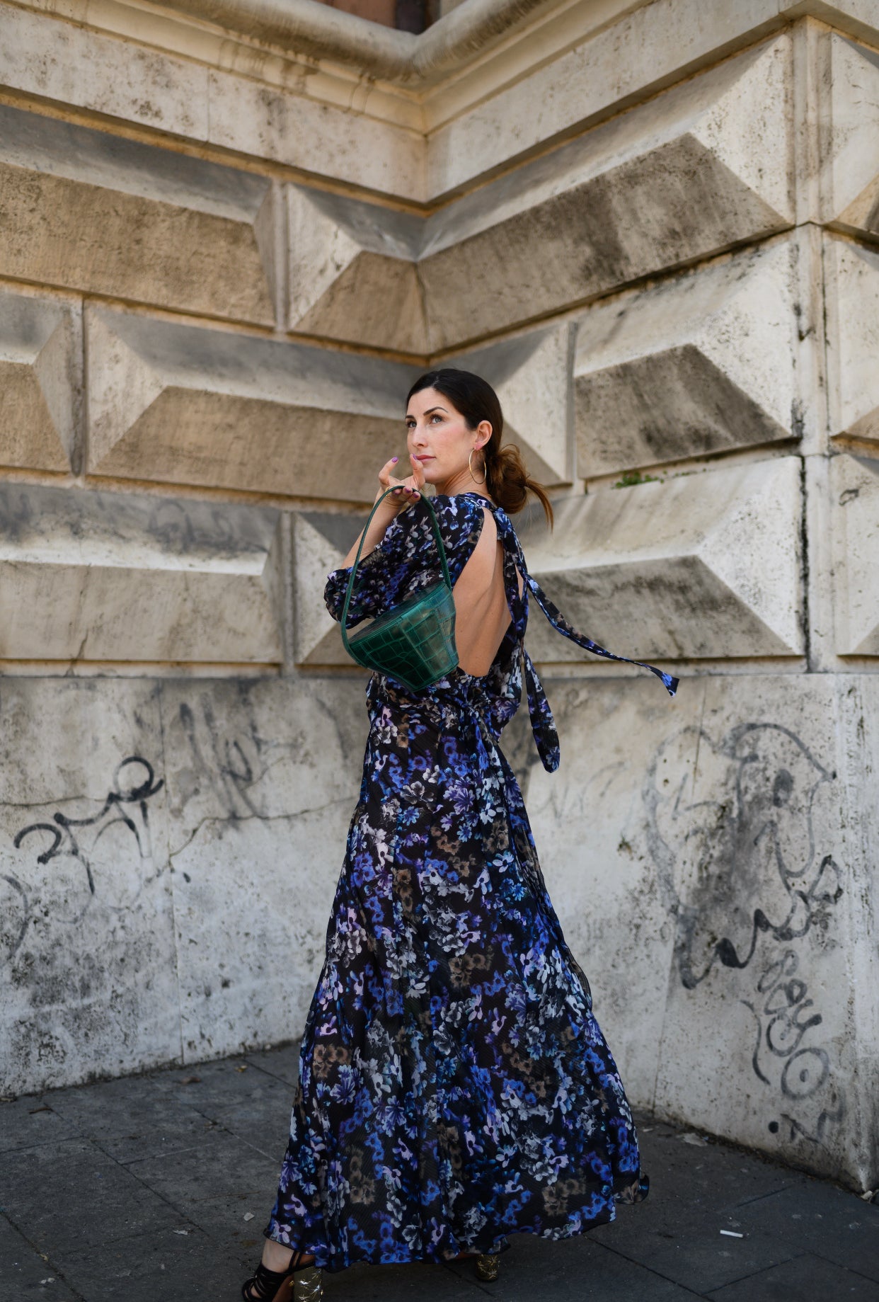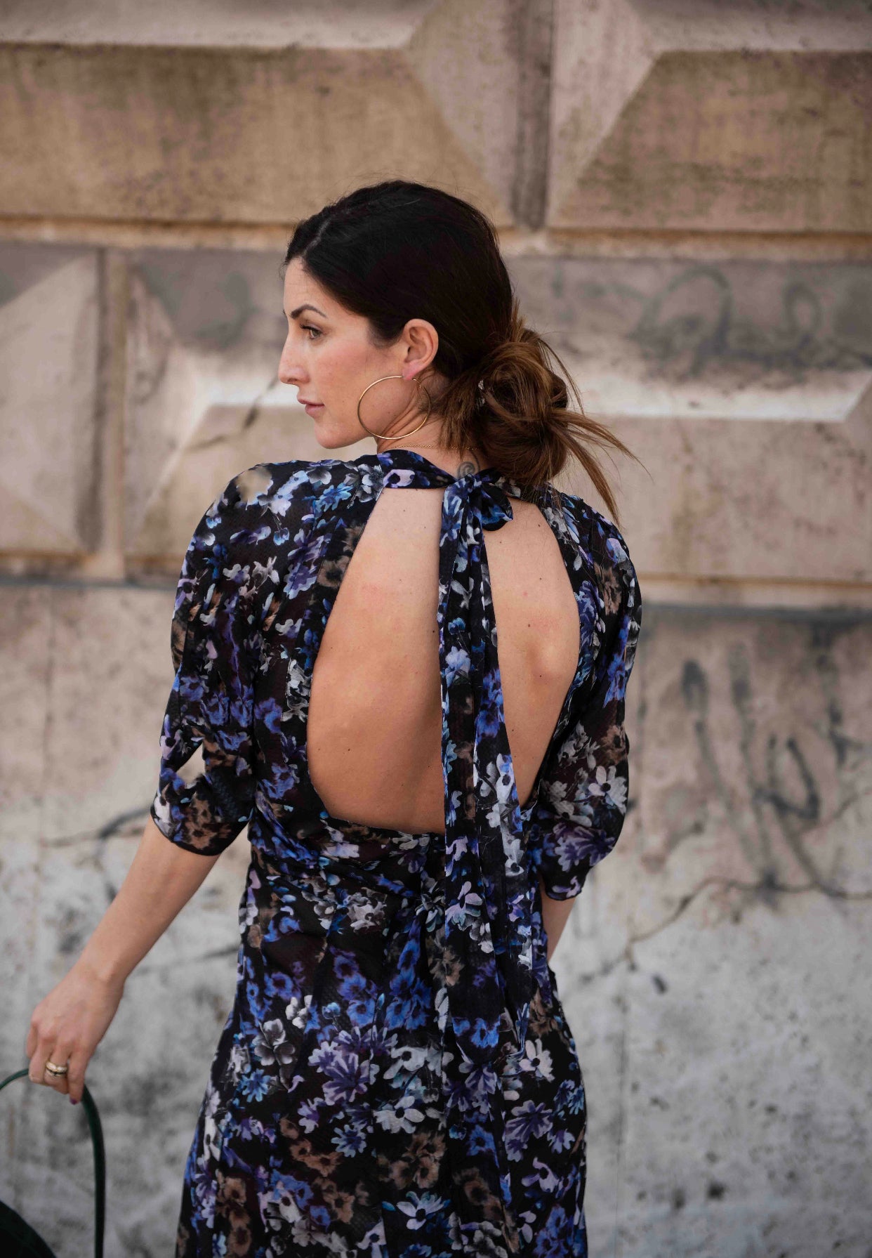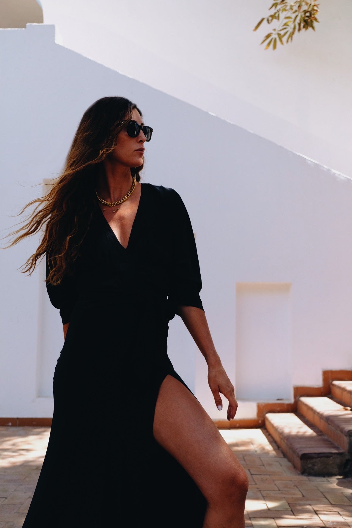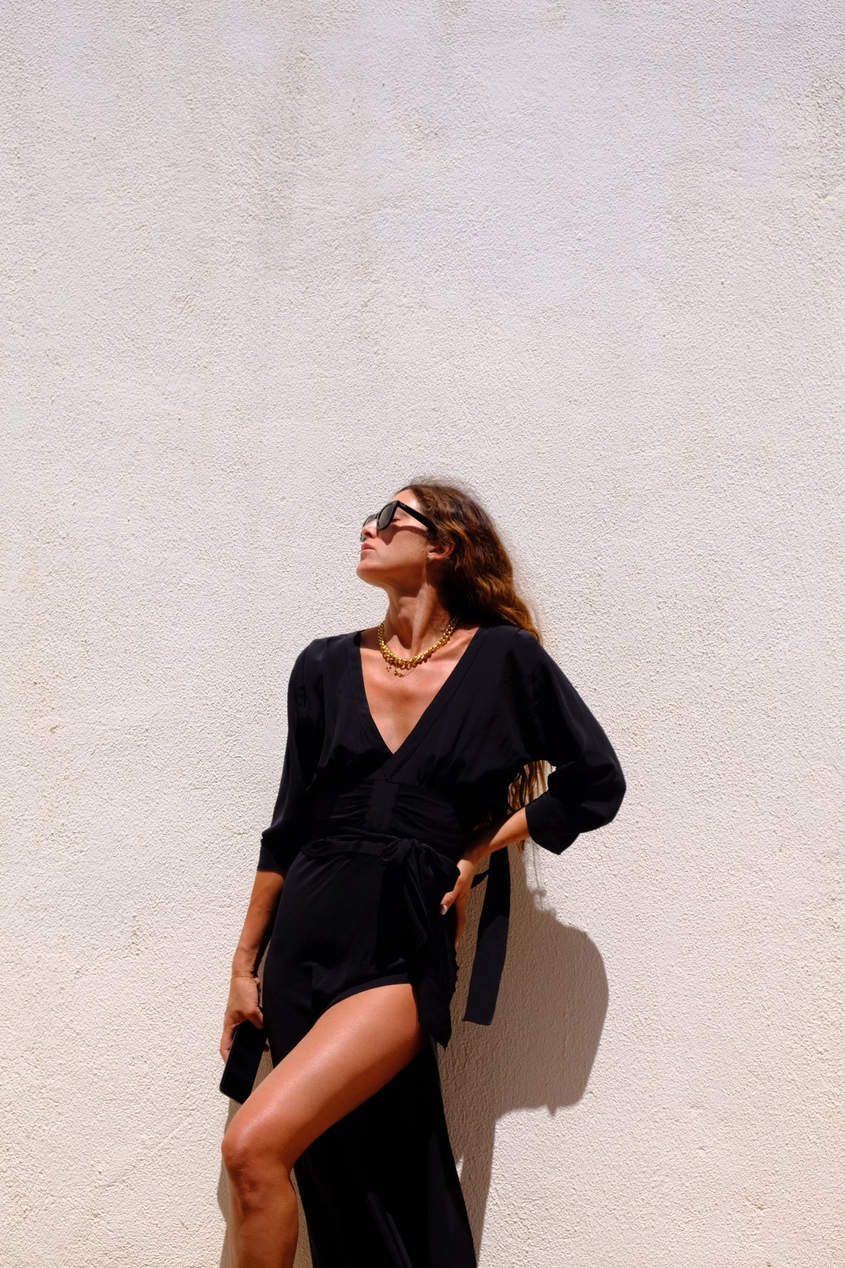 Abito in misto seta con spacco e schiena scollata.