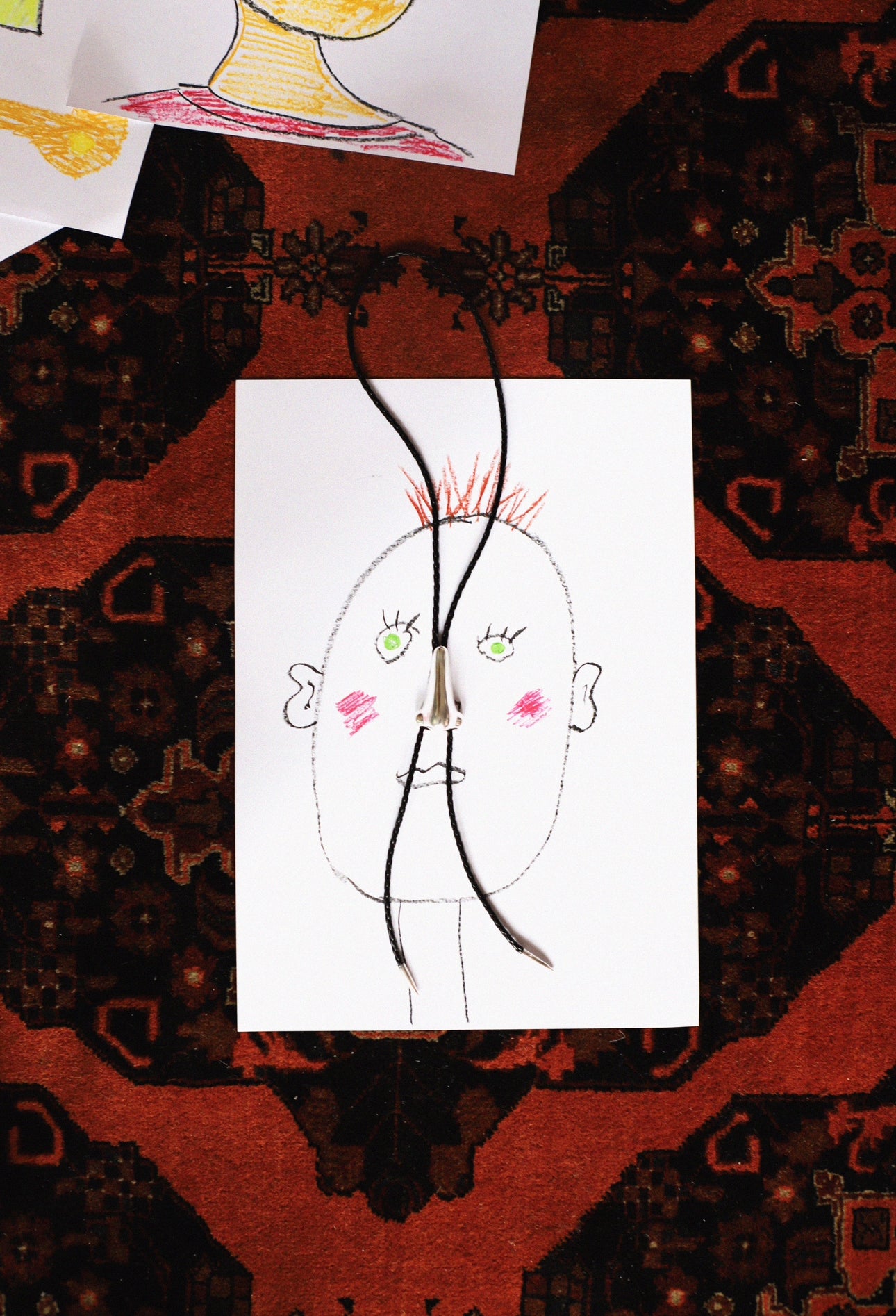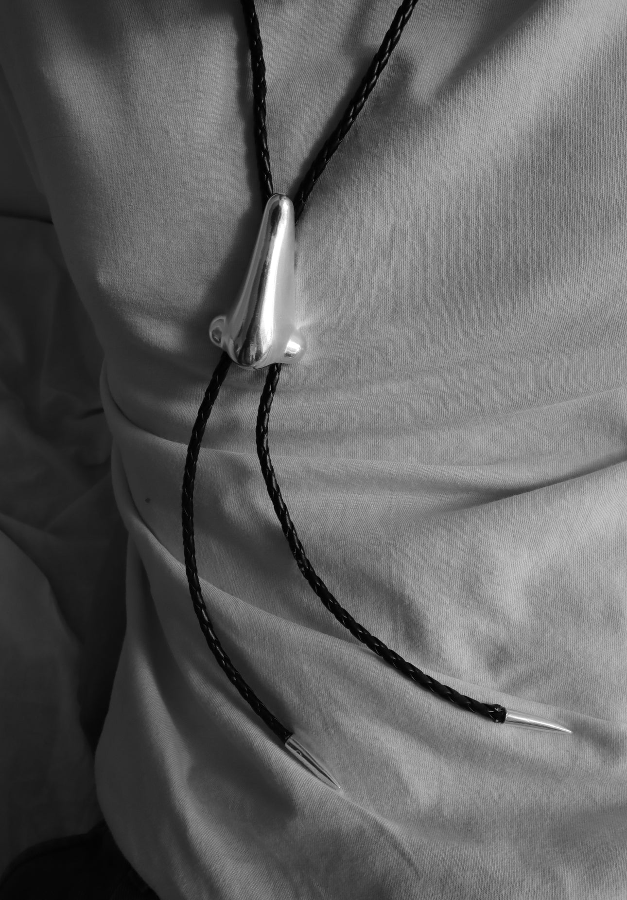 Bolo tie con naso in ottone placcato in argento e cordino in finta pelle.